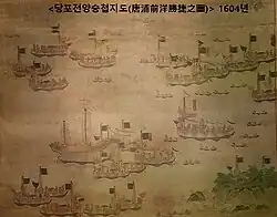 On June 14, 1604,[2] a mysterious ship approached the coast of Dangpo, Tongyeong, where Korea's naval headquarters were located. The ship was an armed Japanese trading vessel, dispatched by Tokugawa Ieyasu to establish trade relations with Cambodia. Its crew consisted of 16 Chinese, 31 Japanese, a Portuguese merchant (João Mendes), and a black crew member. Following a storm, the vessel drifted into Korean waters. The Korean navy, still on high alert after the Imjin War, viewed the ship's presence as a threat. When initial efforts to communicate and requests of a peaceful surrender with the crew failed, tensions escalated, leading to the deployment of Korean warships.[1][2]