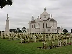 After the war a national necropolis site the graves of French and Colonial fallen was placed here as well as an ossuary, containing the bones of those whose names were not marked. As the replacement of former chapel a new Neo-Byzantine basilica was built between 1921 and 1927 by the architect Louis-Marie Cordonnier and his son Jacques. In total, the cemetery and ossuary hold the remains of more than 40,000 soldiers. With the area of more than 25 hectares it is the largest French military necropolis.