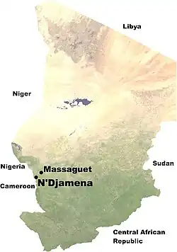 The rebels clashed with government forces, led by President Déby personally, at Massaguet, 80 km (50 mi) northeast of N'Djamena on February 1. The fighting was described as very violent.[23] During the battle the rebels were able to locate and focus fire on President Déby's armoured car. His army chief of staff, Daoud Soumain, was killed, lowering morale.[24] The government forces retreated to the capital.[3]