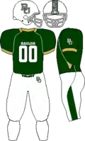 The traditional Baylor uniform worn for home games consists of a gold helmet with a green interlocking BU logo on the sides and green & white stripes down the middle, green jersey, and white or gold pants; a white jersey is substituted for the green one for road games. In recent seasons, both a matte green helmet and a white helmet have been used as alternates to the gold helmet. Black jerseys as well as black or green pants have also been used giving the Bears multiple uniform combinations to choose from.