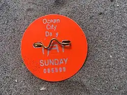 Beach tags for New Jersey beaches can be traced back to 1937 when some towns in the northern portion of the Jersey Shore such as Seaside Heights had brass beach badges marked by gender. Surf City on Long Beach Island started requiring beach tags in 1967.[2] Stone Harbor became the first municipality in the southern portion of the Jersey Shore to require beach tags in 1971, and Sea Isle City followed suit in 1972. In Ocean City, beach tags were implemented in 1976, although discussions for beach fees in the city date back to the 1930s.[3] Long Beach Township on Long Beach Island approved beach tags on November 5, 1976.[2] In 2021, the Cape May County municipalities of Wildwood, North Wildwood, Wildwood Crest, and Upper Township - four of the five municipalities in New Jersey which do not have beach tags - were considering implementing them.[3]
