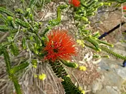 Beaufortia squarrosa, commonly known as sand bottlebrush,[2] is a species of flowering plant in the myrtle family, Myrtaceae and is endemic to the southwest of Western Australia. The Noongar peoples know the plant as buno.[3] It is sometimes a dense shrub, others straggling with 4 neat rows of small, oval leaves along the stems, and heads of red, orange or yellow flowers in the warmer months.