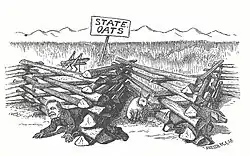 On the other hand, Democratic newspapers enthusiastically supported Hughes' candidacy. This was especially the case with the Denver Mirror, a small newspaper that was published by Stanley G. Fowler.[62] Hughes' opponent, Territorial Governor John Routt, did not make any public speeches during the campaign.[59] He preferred to meet and greet voters face-to-face. At one Republican event, Routt acknowledged that he was not using rhetorical skills like his opponent. He said: "I cannot soar as high as some of my friends on the other side, but I am short and spry, and when it comes to getting into the political pastures I can get in just as quickly as they by crawling through; perhaps I can beat them in, for they have to soar high to avoid the fences." The Denver Mirror then used the image of Routt crawling through the fences to paint him in multiple cartoons as a carpetbagger, who had not been elected but appointed to the territorial governorship by President Grant after serving in different political roles in Illinois and Washington, DC.[62] The first cartoon was published on September 17, 1876. Fowler was successful with his cartoons, which were received attention across the whole state. Routt was amused by the caricatures and began to distribute copies of them at his campaign events.[62] In its last cartoon concerning the 1876 State Elections on October 1, 1876, the Denver Mirror called its readers to support Hughes and other Democratic candidates, stressing their support for the Silver Dollar and political reforms, while alleging that a Republican state government would be tainted by corruption.[63]