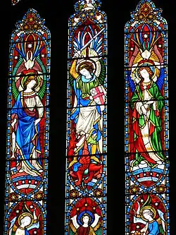 The church is noted for the quality of its sculpture and stained glass. There are windows depicting angels with harps, cymbals and pipes.There are also a number of windows which depict English Martyrs. There is an angel reredos in the east end of the church and a Victorian glass window showing the archangels Michael (the abbey's patron, sword and shield in hand, trampling the dragon), Raphael and Gabriel and the nine choirs of angels as an angelic orchestra sounding of praises of God.[10]