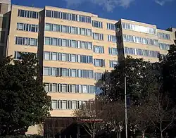 Building upon their previous experience, Berla & Abel developed a busy practice based on the design of large apartment buildings. As the public face of the firm, Berla was an uncompromising advocate for modern architecture and the partners were financially rewarded for it as their expertise placed them in an enviable position in the immediate post-World War II population boom, which necessitated extensive housing construction.[1] Their reputation as uncompromising modernists attracted a number of young architects to the firm, including Arthur H. Keyes, Francis D. Lethbridge, Nicholas Satterlee and Chloethiel Woodard Smith. In 1951 these established their own firm, Keyes, Smith, Satterlee & Lethbridge. This firm and its two successors, led by Keyes and Smith, became Berla & Abel's most successful competitors in the ensuing decades.[2] Their departure left an opening for another senior employee, Jesse Weinstein, who was made an associate in 1947 and a partner in 1963. In 1969, as Berla approached retirement, the firm was renamed Berla, Abel & Weinstein to reflect Weinstein's growing role.[3] Berla retired from the partnership in 1971,[4] followed by Abel in 1974. Weinstein continued the firm under the name of Abel & Weinstein in Washington until 1977 and in Chevy Chase until the firm's dissolution in 1996.[5] Though the firm's influence began to wane in the 1960s, they continued to be considered for major projects into the 1980s. Later employees included Weinstein's daughter, architect Amy Weinstein, who was later credited by local architectural historian G. Martin Moeller Jr. with the reintroduction of polychromy into Washington architecture in the 1980s.[6]