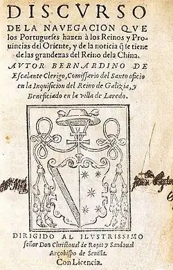 Of particular historical interest is Escalante's first published book, Discurso de la navegacion que los Portugueses hacen a los Reinos y Provincias de Oriente, y de la noticia que se tiene de las grandezas del Reino de la China (Discourse of the navigation made by the Portuguese to the kingdoms and provinces of the Orient, and of the existing knowledge of the greatness of the Kingdom of China). Published in Sevilla in 1577, it became, according to Donald F. Lach, the second European book primarily dedicated to China, after Gaspar da Cruz' Tratado das cousas da China (1569).[2]