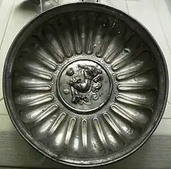 Four of the bowls have incised emblematic designs associated with Mercury, and the formulaic Latin initialism VSLM, standing for votum solvit libens merito ("He fulfils his vow freely, as is deserved").[12] Nine of the vessels form a group of luxury domestic silver of 1st century date[13] with iconographic connections to Dionysus rather than to Mercury, marked as votive offerings (vota) of one Q. Domitius Tutus; they include a matching pair of silver drinking cups (scyphi) with Dionysiac imagery of centaurs,[14] and a pair of silver wine-jugs.[8]