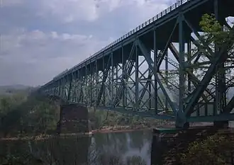 The Bessemer & Lake Erie Railroad Bridge is a truss bridge that carries the Canadian National Railway's Bessemer and Lake Erie Railroad division across the Allegheny River between the Pittsburgh suburbs of Plum and Harmar Township, Pennsylvania. In 1897, a single-track trestle and viaduct was built on this site; in 1918, the original piers were doubled in width, the current double-tracked structure built alongside, and then slid into place. The original north trestle approach was buried in slag dumped from an adjacent temporary filling trestle.[2]