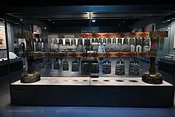 Among the most important sets of bianzhong discovered are a complete ceremonial set of 65 zhong bells, found in a near-perfect state of preservation during the excavation of the tomb of Marquis Yi, who died c. 430 BCE.[9] Yi was the ruler of Zeng, one of the minor states under control of the major State of Chu. This region is now part of the present-day Hubei province. The instrument is currently on display at the Hubei Provincial Museum in Wuhan, China. It under protection by the government as an esteemed cultural relic, and has been performed on three times since its excavation in 1978, the most recent being for the Hong Kong Reunification ceremony in 1997.[10]