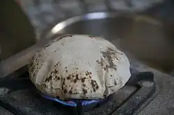 Bihari cuisine include litti chokha,[2] a baked salted wheat-flour cake filled with sattu (baked chickpea flour) and some special spices, which is served with baigan bharta,[3] made of roasted eggplant (brinjal) and tomatoes.[4][5] Dairy products are consumed frequently throughout the year, including dahi (yogurt), spiced buttermilk (known as mattha), ghee, lassi and butter.