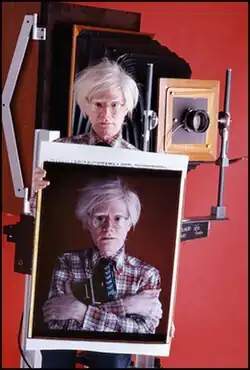 Ray left Life after it ceased weekly publication in 1972.[13] Over the next few years he did freelance work for other magazines, including Smithsonian, Archaeology, Fortune and Travel and Leisure. During that period he made 46 cover photos for Newsweek, including one of Andy Warhol that attracted more than usual attention.[2] Ray took the Warhol photo in 1980 using a view camera that had been made by the Polaroid Corporation that was capable of producing instant photographs 22 1/2 × 30 inches from edge to edge.[27] A critic said the photo (shown at left) was "a trenchant portrait of the master of replicated reality."[28]