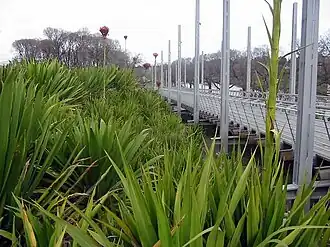 In addition to the mature elms along the river bank and at Speakers Corner, about 200 new trees were planted in the park during its construction. The new plantings focus on Australian species including a mass planting of Macrozamia communis (cycads) on the embankment overlooking Speakers Corner. Also in this area are several Doryanthes excelsa (gymea lilies) and Lepidozamia peroffskyana (pineapple zamia, another cycad). Hundreds of smaller Australian native plants are also present although construction of the William Barak Bridge, which was not part of the original design for the park, destroyed one of the major display plantings on the north-facing embankment of the middle terrace.