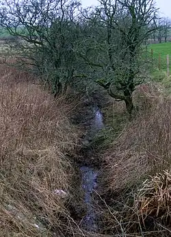 The Black Loch, just over 400 metres long, is the deepest of three linked lochs within the Parish of New Cumnock. It is unusual in that its northerly outflow is into the Glaisnock Water, flowing into the Lugar Water and the River Ayr, finally emptying into the Firth of Clyde, while the southerly outflow runs into the River Nith and thence into the Solway Firth.[3] The Segsy Burn is a minor inflow from the north-west, and the Polquhap enters at the north-west, rising from Glaisnock Moss.