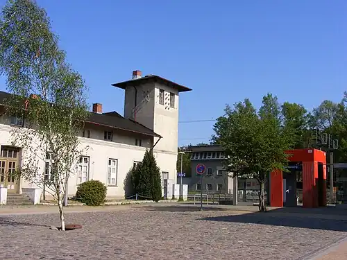 The neo-classical entrance building dates from time of the opening of the station.[5] Its eastern side is a single-storey building with a small tower and the western side is two storeys; each side also has an attic. The precincts of the station forecourt with the post office building on the east side were built at the same time. The two-storey entrance building of the Wismar–Karow line served later as a residential building. East of the station forecourt there were originally a locomotive shed build with timber trusses and a water supply point with a water tower and a signal tower.[5]