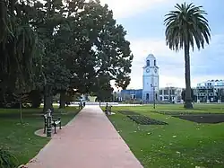 Blenheim is on the Main North Line, the northern part of the unofficially-named South Island Main Trunk Railway. The Coastal Pacific, a long-distance passenger train between Picton and Christchurch, stops at Blenheim railway station.[19] The 1906 station has been listed NZHPT Category II since 1982.[20] It is a standard Vintage station, with Tudor half-timbering and tile.[21]