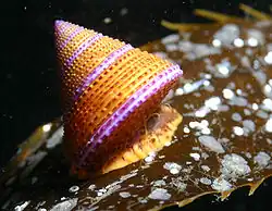| Calliostoma annulatum crawling on a kelp leaf | |