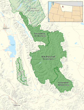 The Bob Marshall Wilderness Complex consists of three wilderness areas, all within the U.S. state of Montana, totalling over 1.5 million acres (6,100 km).[1] The largest wilderness area is the Bob Marshall Wilderness Area consisting of one million acres (4000 km). Adjoining the Bob Marshall to the north is the Great Bear Wilderness of 286,700 acres (1,160 km), and to the south of the Bob Marshall is the Scapegoat Wilderness consisting of 239,936 acres (971 km). An additional one million acres of roadless National Forest, private, and BLM land surrounds the designated wildernesses on all sides, for a total roadless area of 2.54 million acres.[2]