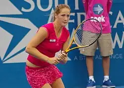 Jovanovski opened the season in Brisbane,[28][29] defeating Anastasia Rodionova in the first round.[30] She then lost to Anastasia Pavlyuchenkova in the second.[31] The week after, Jovanovski qualified for the Sydney International.[32] She defeated Kaia Kanepi,[33] Aravane Rezaï[34] and Flavia Pennetta,[35] but lost her first tour semifinal to eventual champion Li Na.[36] At the Australian Open, Jovanovski defeated Chang Kai-chen in the first round but lost to the second seed Vera Zvonareva in round two.[37] She also played doubles partnering with Varvara Lepchenko; they lost to Kimiko Date-Krumm and Zhang Shuai. Jovanovski was the highest ranked player in the Serbia Fed Cup team for the World Group II rubber against Canada.[38] She played alongside Ana Jovanović, Aleksandra Krunić and Tamara Čurović against Rebecca Marino, Aleksandra Wozniak, Marie-Ève Pelletier and Sharon Fichman in Novi Sad.[39] She won both of her singles matches against Wozniak and Marino. In the doubles match, Jovanovski and Krunić defeated Fichman and Pelletier to guarantee Serbia a spot in the World Group Playoffs.