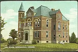 The original Bowmanville High School was built and opened on December 12, 1890.[5] It was located closer to downtown Bowmanville on Queen Street, at the end of Division Street south. By the late 1920s, the school was overcrowded. In 1929, a storm damaged the original belfry which resulted in its removal. At the same time, the high school had an addition to the front, opening on February 1, 1930. This provided new facilities for the students and more space. Over time, it became more crowded again. The second addition was added to the back, starting in 1954 and finishing in 1957. Due to steelwork shortage and poor constructing, it took 4 years to complete. This section opened on November 28 of the year. With an aging school, not enough modern facilities and overcrowding once again with portables being needed, a new school was built to replace it. It closed at the end of the school year in June 1972.