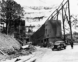 ![]() Rear view of the incomplete launching ramp for German V-1 flying bombs, at Brécourt, Cherbourg, 12 July 1944. Note the camouflage netting suspended over the site. | |