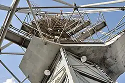 Altogether, the pillars, the volume, and the metal tower are 224 meters. It is possible to climb the tower by an elevator and a stairway to the belvedere, and from there, only by a stairway for maintenance of the transmission tower.[1]