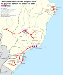 There were efforts to distance the president from the left, and opposition funding of the 1962 elections would not make sense if the coup had already been decided.[66] The conspiracy gained strength after the restoration of presidentialism in January 1963.[67][e] After the Sergeants' Revolt and the request for a state of emergency in late 1963, many officers became suspicious of the president's intentions and joined the conspiracy with a "defensive" intent.[68] The PSD's passage to the opposition on March 10, 1964, was considered a signal by civilian and military conspirators. Throughout the month, radicalization fueled the assumption that the president was seeking a self-coup. Parliamentarians came to agree with the conspirators.[18] In military memory, the month's events led to the accession of the undecided and formed the trigger for the coup.[69]