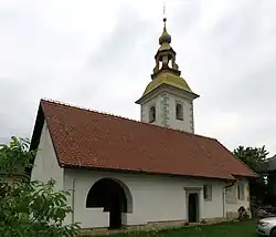 St. Radegund's Church, a Gothic structure, was first mentioned in 1468 as a church belonging to the Diocese of Radovljica, but is an older building with Romanesque foundations, partly reflected in the shape of nave and its flat ceiling. Most of the remaining structure is from the mid-17th century. There are two entrances to the church, one from the 14th century and a dated Renaissance portal from 1629. The bell tower with its typical onion-shaped roof is Baroque. There are frescoes of St. Radegund and St. Lawrence on the southern wall. St. Michael fighting a dragon is depicted on the northern wall and there is a baroque painting of St. Christopher on the southern exterior. There is evidence of a wall encircling the church, probably built in the 15th century to protect local inhabitants against Turkish raids in the area.[4] This was demolished in the 17th century, when the church was being rebuilt.