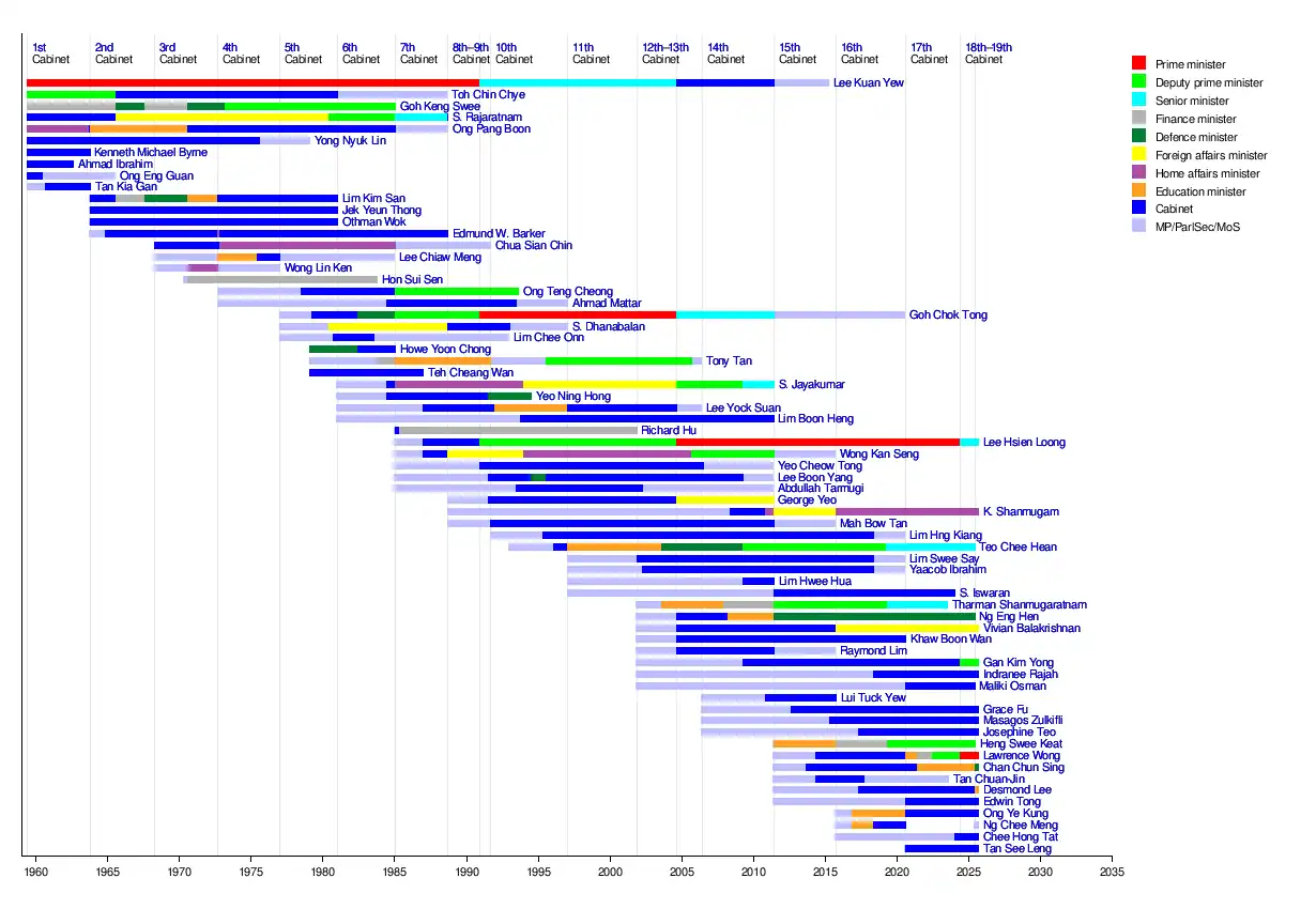 The following is a list of the members of the Cabinet of Singapore since the 1959 Singaporean general election. Members ranked first have held either the office of prime minister, deputy prime minister, senior minister or principal cabinet portfolios (finance, defence, foreign affairs and home affairs). This list excludes ministers of state and parliamentary secretaries.