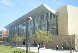 Classes started on September 24, 1956, in temporary buildings, with an enrollment of 1,500 students.[10][12] Delmar Oviatt, the former namesake of the campus library (subsequently renamed University Library), was the dean of the satellite campus until July 1, 1958, when the campus separated from Los Angeles State College and was renamed San Fernando Valley State College (popularly abbreviated to Valley State College, Valley State, or SFVSC) after the California Legislature passed Assembly Bill No. 971.[13][14] Ralph Prator was assigned as the first president of the university and enrollment reached 2,525 with a tuition of $29 per semester.[8][10] During that same year, the first graduation ceremony was held for around 100 students at the Hollywood Bowl; it was held on campus during subsequent years.[10] In 1959, the university became the first State College to have its own computer.[8] In 1964, the pioneering computer lab was moved into new quarters in the recently completed Sierra Hall building complex, and student enrollment reached nearly 12,000.[8] Buildings were swiftly constructed during the early 1960s.[10] Additionally, in November 1963 the university established its own radio station, which continues operation to this day as KCSN.[10]