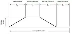 Cams can be characterized by their displacement diagrams, which reflect the changing position a follower would make as the surface of the cam moves in contact with the follower. In the example shown, the cam rotates about an axis. These diagrams relate angular position, usually in degrees, to the radial displacement experienced at that position. Displacement diagrams are traditionally presented as graphs with non-negative values. A simple displacement diagram illustrates the follower motion at a constant velocity rise followed by a similar return with a dwell in between as depicted in figure 2.[4] The rise is the motion of the follower away from the cam center, dwell is the motion where the follower is at rest, and return is the motion of the follower toward the cam center.[5]