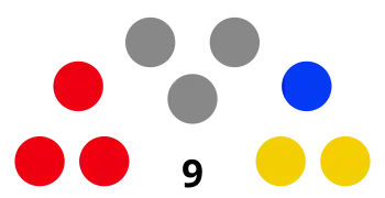 Camden Council is composed of nine councillors elected proportionally as three separate wards, each electing three councillors. All councillors are elected for a fixed four-year term of office. The mayor is elected by the councillors at the first meeting of the council. The most recent election was held on 14 September 2024, and the makeup of the council is as follows:[7][8][9]