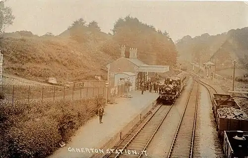 Camerton (Somerset) railway station served the village of Camerton, England from 1882 to 1951 on the Bristol and North Somerset Railway. In common with the other stations on the line it had a single platform for passengers, but also had a loop line so that two trains could pass. Diverging away from the through line at the east end of the station was the access line and associated sidings belonging to Camerton colliery. There was a substantial station building on the platform - this originally had a canopy but this was removed after passenger services ceased.