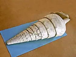| Fossil shell of Campanile auvertianum from France, on display at Galerie de paléontologie et d'anatomie comparée in Paris | |