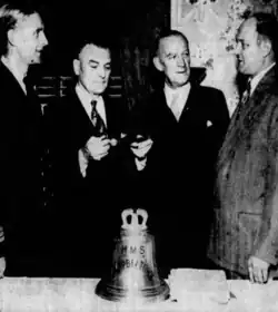 After the war, the bell resided in the Scottish Campbeltown until 1950, when British consul-general H. C. McClelland wrote a letter to the mayor of Lebanon announcing that the ship's bell was being bequeathed to the city in recognition of a special bond between the town and the United Kingdom. The bell sits in the South Londonderry Township municipal building as a symbol of Campbelltown.[15] In 1988 the people of Campbelltown voted to lend the bell to the new ship HMS Campbeltown (F86) for as long as she remained in Royal Navy service.[16] The bell was returned to the town on June 21, 2011 when HMS Campbeltown was decommissioned. A new Type 31 HMS Campbeltown was announced as part of the new Inspiration class of frigates for the Royal Navy on May 19, 2021.[17]