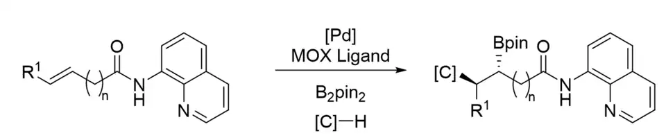 - ^ a b Liu, Z.; Ni, H. Q.; Zeng, T.; Engle, K. M. (2018). "Catalytic Carbo- and Aminoboration of Alkenyl Carbonyl Compounds via Five- and Six-Membered Palladacycles". Journal of the American Chemical Society. 140 (9): 3223–3227. doi:10.1021/jacs.8b00881. PMC 6002770. PMID 29384373.