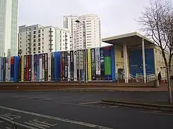 Cardiff Central Library (now Cardiff Central Library Hub) (Welsh: Llyfrgell Ganolog Caerdydd) is the main library in the city centre of Cardiff, Wales. It offers a public library service and is open six days a week. Four buildings have been named as such, with the newest building opening on 14 March 2009 and officially being opened a few months later on 18 June 2009 by the Manic Street Preachers.[1] The first Cardiff library was opened in 1861 as the Cardiff Free Library, later expanded and known as the Cardiff Free Library, Museum and Schools for Science and Art.