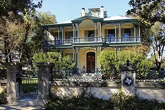 The Carl Wilhelm August Groos House is located in the Bexar County city of San Antonio in the U.S. state of Texas. It was designated a Recorded Texas Historic Landmark in 1977.[2] Designed by Alfred Giles in 1880, the building contractor was John H. Kampmann.[3] Giles used a Victorian Gothic Revival on this limestone home. Groos had immigrated from Germany to Texas in 1848, at which time he and his brothers started a freighting firm. In 1871, he built the Carl W. A. Groos House in New Braunfels. In 1872, he and his family settled in San Antonio. Groos married Hulda Amalie Moureau and became a founding member of the Groos National Bank. In 1880, Groos hired Giles to build his San Antonio home.[4] It is listed on the National Register of Historic Places listings in Bexar County, Texas as a contributing structure of the King William Historic District.[5] Groos died in 1893.[2] In 1957, the house was purchased by the San Antonio Council of the Girl Scouts of the USA. The Girl Scouts sold the home to Charles Butt. It has been restored and is in private ownership.[6]