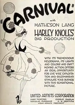 Carnival is a 1921 British silent drama film directed by Harley Knoles and starring Matheson Lang, Ivor Novello and Hilda Bayley.[1] During a production of William Shakespeare's Othello in Venice, an Italian actor suspects his wife of having an affair and plans to murder her on stage. It was based on a stage play of the year before, of which Matheson Lang was one of the writers.[2] The film was a popular success, and was re-released the following year. In 1931, it was remade as a sound film, Carnival, directed by Herbert Wilcox.[3]