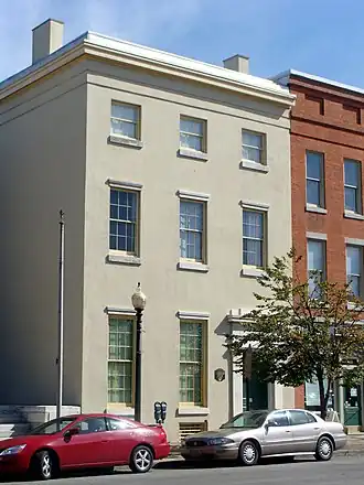 The Cashier's House was designed by the Philadelphia architect William Kelly, and was built in 1839 as part of a complex; the other components of the development were the Coach House and the Old Custom House. The Cashier's House was built primarily as the residence for the chief executive officer of the next door Erie Branch of the Bank of the United States.[3] The bank closed in 1841, but the cashier of the bank continued to live in the house until his death in 1843.[3] In 1850, the house was sold for $4,000 ($134,986 in present-day terms) at half of its original cost.[3] The Cashier's House was bought by Samuel Woodruff in 1872.[4] The Woodruffs occupied the Cashier's House until 1913, leading the house to sometimes be referred to as the "Woodruff Residence" or "Woodruff House."[3][5]