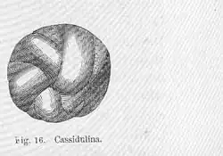 Cassidulina is a genus of foraminifera described in the Treatise Part C. (Loeblich & Tappan, 1964), as having a free, lenticular test, with central boss of clear calcite on either side. Chambers are biserially arranged, enrolled planispirally with a subangular to keeled periphery. The wall is calcareous, hyaline (glassy), optically granular, perforate. The surface is smooth with a polished appearance. Sutures are radial to oblique, straight or curved. The aperture is a narrow arched slip at the base of the apertural face, partly closed by an apertural place. (Loeblich and Tappan 1988)