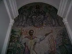 The Saint Patrick mosaic represents the saint lighting the Paschal fire on the mount of Slane. The principal figure is that of the saint in his apostolic mission, lifting the cross in a vigorous movement, in his other hand holding a torch. The firewood is arranged in a Christogram, signifying the symbolic importance of the fire.