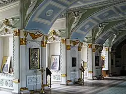 The cathedral walls were decorated with alabaster under white marble and with engaged columns, stucco on biblical subjects, and 23 paintings on religious motives. The paintings were created by icon painter Rukavitsyn and pasted on the walls.[40] The dome was painted using an outdoor technique.[41][42] The main altar of the cathedral was dedicated to the Theotokos of Kursk. There was also a chapel on the southern side dedicated to St. Mitrofany of Voronezh and Alexander Nevsky, and a chapel on the northern side dedicated to Tikhon of Zadonsk and Seraphim of Sarov. On the southern side of the cathedral, there was also a chapel dedicated to St. Nicholas of Myra.[43] Above the refectory was originally a church with three priests. It was named for the Presentation of the Lord, St. Nicholas and St. Anthony and Theodosius of Pechersk. This church was abolished in 1837. The iconostases of the side chapels were made of gilded wood, and the one-tier iconostasis of the main altar had an unusual artistic solution — it was cast in cast iron and gilded. All the icons on the main iconostasis were painted on canvas by the St. Petersburg artist Borghi[44] for 15,000 rubles.[41][39] The king's gate, north and south gates were also made of cast iron and gilded. To the left of the iconostasis of the main altar, high enough there was a large silver casket for the Theotokos of Kursk.[42] It had a cast-iron with gilded shade, to which several stone steps led. In front of the icon hung an expensive velvet veil embroidered with gold, silver, and pearls.[8]
