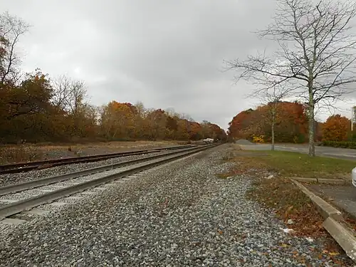 Looking east at the former Center Moriches LIRR station | |||||||||||