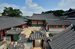 For the rest of his reign, Taejong primarily resided in Changdeokgung.[15] Gyeongbokgung's restoration was ordered only after Taejong had moved into Changdeokgung.[7] Even after his abdication, he resided in the palace Suganggung (수강궁; 壽康宮; later became Changgyeonggung) next to Changdeokgung; from there he influenced the reign of his son Sejong the Great (r. 1418–1450).[9] Even after Taejong's abdication, construction continued. Part of a building collapsed and the supervisor of that building's construction was exiled as punishment. By 1418, facilities were deemed adequate enough to hold more significant ceremonies at Changdeokgung instead of at Gyeongbokgung.[8] From the third year of Sejong's reign, Sejong began putting more emphasis on Gyeongbokgung and moved frequently between the two palaces.[16][5] In 1426, he ordered that many structures in Changdeokgung be named.[16] In 1427, he entirely moved out of Changdeokgung and resided primarily in Gyeongbokgung, although he continued moving between the two frequently.[16][5] King Sejo (r. 1455–1468) significantly expanded Changdeokgung to the north and east. For one such project, 19,000 people from the Hanyang region were assembled. King Seongjo (r. 1469–1495) also expanded the palace and resided in Changdeokgung for the entirety of his reign. In 1475, he had all 29 of the palace's gates named and held a ceremony for the installation of their name plaques.[17] As there was not enough space in Changdeokgung for all the living queens in the royal family, he decided to expand Changgyeonggung for them instead.[3] King Yeonsangun (r. 1495–1506) also greatly renovated the palace, although renovations were put to a halt when he was deposed.[18]