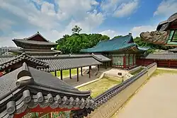 A single-story hall where the king received council and conducted politics.[92] It is a designated Treasure.[82] Spirit tablets were also possibly stored here.[92] It was built in 1405 and originally named Jogyecheong (조계청; 朝啓廳; Chogyech'ŏng). It received its current name in 1461. After being destroyed in 1592 during the Imjin War, it was rebuilt in 1608. It was destroyed in 1623 during the Injo coup and rebuilt in 1647, using materials recycled from a building called Gwangjeongjeon in In'gyŏnggung. It has since become the oldest extant building in the palace.[93] It is the only remaining Joseon palace building with blue roof tiles, which were then considered luxurious and difficult to make.[94][95] During the colonial period, the building was opened to the public, and glass put in its windows. The building was restored to its pre-colonial appearance in 1996.[95] |