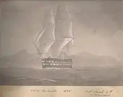 Promoted to rear admiral on 5 August 1861,[5] Elliot became Commander-in-Chief, South East Coast of America Station, with his broad pennant in the second-rate HMS Bombay, in April 1864.[1] This post was based in the Falkland Islands. After HMS Bombay was destroyed by accident in a fire on the River Plate in December 1864, he transferred his flag to the frigate HMS Narcissus.[1]
