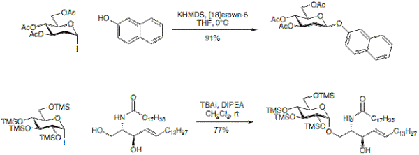 Iodide donors may typically be activated under basic conditions to give β-glycosides with good selectivity. The use of tetraalkylammonium iodide salts such as tetrabutylammonium iodide (TBAI) allows for in-situ anomerization of the α-glycosyl halide to the β-glycosyl halide and provides the α-glycoside in good selectivity.[13][14][15][16]