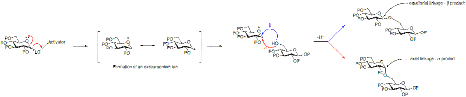 The formation of a glycosidic linkage results in the formation of a new stereogenic centre and therefore a mixture of products may be expected to result. The linkage formed may either be axial or equatorial (α or β with respect to glucose). To better understand this, the mechanism of a glycosylation reaction must be considered.