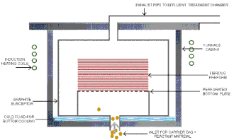 During chemical vapour infiltration, the fibrous preform is supported on a porous metallic plate through which a mixture of carrier gas along with matrix material is passed at an elevated temperature. The preforms can be made using yarns or woven fabrics or they can be filament-wound or braided three-dimensional shapes.[4] The infiltration takes place in a reactor which is connected to an effluent-treatment plant where the gases and residual matrix material are chemically treated. Induction heating is used in a conventional isothermal and isobaric CVI.