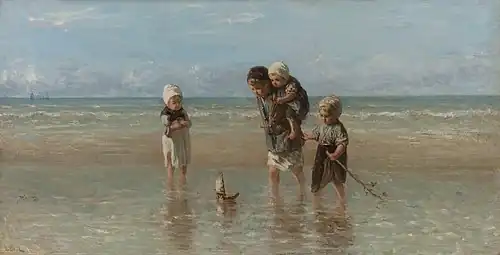 Many of Israëls's paintings show peasants at work or resting. While documenting the lives and struggles of fishermen he took time to document the joy and innocence of children at play.[3] He created at least 13 different versions or configurations of children playing by the sea.